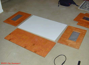 This picture shows the first step in the assembly. The sides and back are already cut and stained, and the vent windows are finished. The ventilation windows were cut out with a jig saw and covered with black aluminum window screening, then framed with latice strips. These vents are designed the same as in another cage I have built, and if you would like to see a detailed description of how they are done, you can click here.
