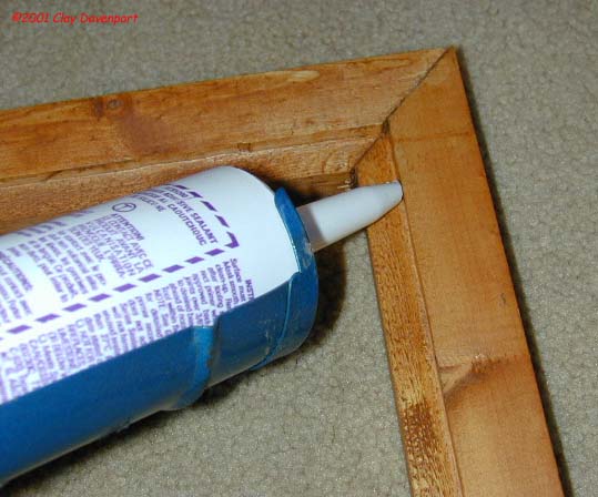 To assemble the door frames I used a 90° clamp to hold the peices in place. These clamps are around $6 at Lowe's and I have found them to be invaluable in making these joints. A bead of wood glue was used in each corner, and the two pieces clamped in place. I then drilled 2 pilot holes one from each direction and offset from each other as shown in the following pictures.